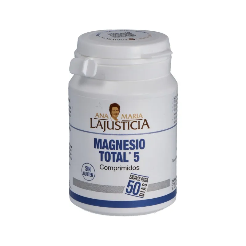 Ana María LaJusticia Magnesio Total 5 sales es un complemento alimenticio que reúne cinco formas de magnesio de elevada pureza y biodisponibilidad. Cada comprimido integra magnesio en forma de citrato, malato, glicinato, óxido y aspartato, permitiendo su absorción gradual en diferentes procesos metabólicos. Con la ingesta diaria recomendada, se aporta aproximadamente el 98% del Valor de Referencia de Nutrientes (VRN) de magnesio, mineral esencial para el funcionamiento normal de más de 300 reacciones enzimáticas.