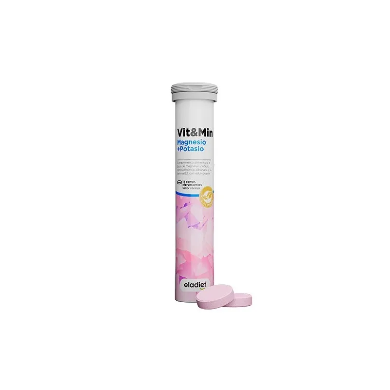 Eladiet Vit&Min magnesio + potasio es un complemento alimenticio efervescente que proporciona magnesio, potasio, vitamina C y vitamina B12 dentro de una dieta variada y equilibrada. Sus ingredientes han sido seleccionados para contribuir al equilibrio electrolítico y al funcionamiento normal del sistema nervioso y muscular.