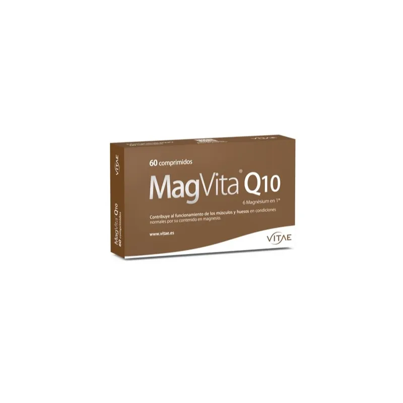 Vitae MagVita Q10 es un complemento alimenticio que combina magnesio, coenzima Q10 y taurina en formato de 60 comprimidos. Sus ingredientes intervienen en los procesos de producción de energía celular, contribuyendo al metabolismo energético normal y al mantenimiento del equilibrio electrolítico. La taurina apoya la función cardíaca normal y la coenzima Q10 participa en la cadena de transporte de electrones para la síntesis de ATP.