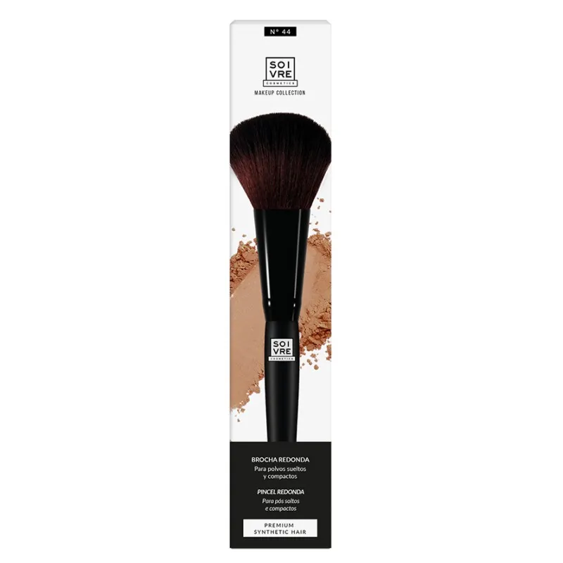 Soivre Brocha Redonda Nº44: diseñada para aplicar polvos sueltos y compactos, asegura una cobertura perfecta y un acabado natural suave y uniforme.