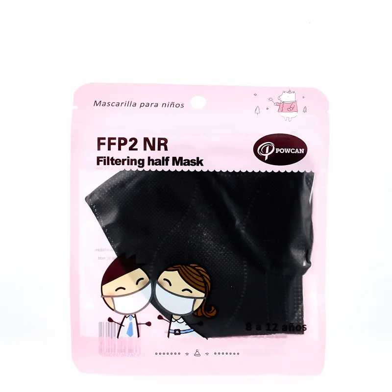 Mascarilla Infantil FFP2 color negro. Alta capacidad de filtración. Ajuste perfecto con gomas laterales a las orejas y flexible en la nariz. Desechables.