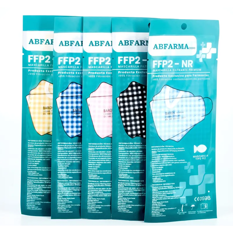 Mascarilla FFP2 con estampado de cuadradito de diferentes colores, producto de ultra protección que tiene la capacidad de filtrar hasta un 95% de las partículas de aire.