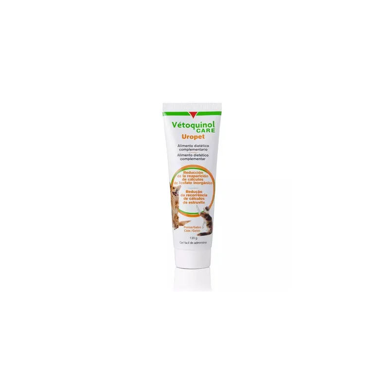 Uro-Pet 120g es un suplemento dietético particularmente diseñado para prevenir la creación de cálculos de fosfato inorgánico en perros y gatos. Su fabricante Vetoquinol lo ofrece en un formato de pasta palatable que es adecuado para aquellos animales propensos a la formación de piedras de fosfato y al síndrome urológico felino.