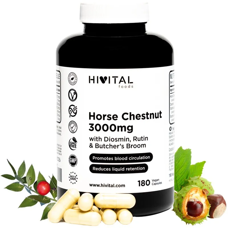 Hivital Castaño de Indias 3000 mg, 180 cápsulas, es un complemento alimenticio que aporta extracto seco de Castaño de Indias (Aesculus hippocastanum) estandarizado en escina y flavonoides. Este formato está diseñado para quienes desean complementar su ingesta de principios activos vegetales y apoyar el equilibrio circulatorio.