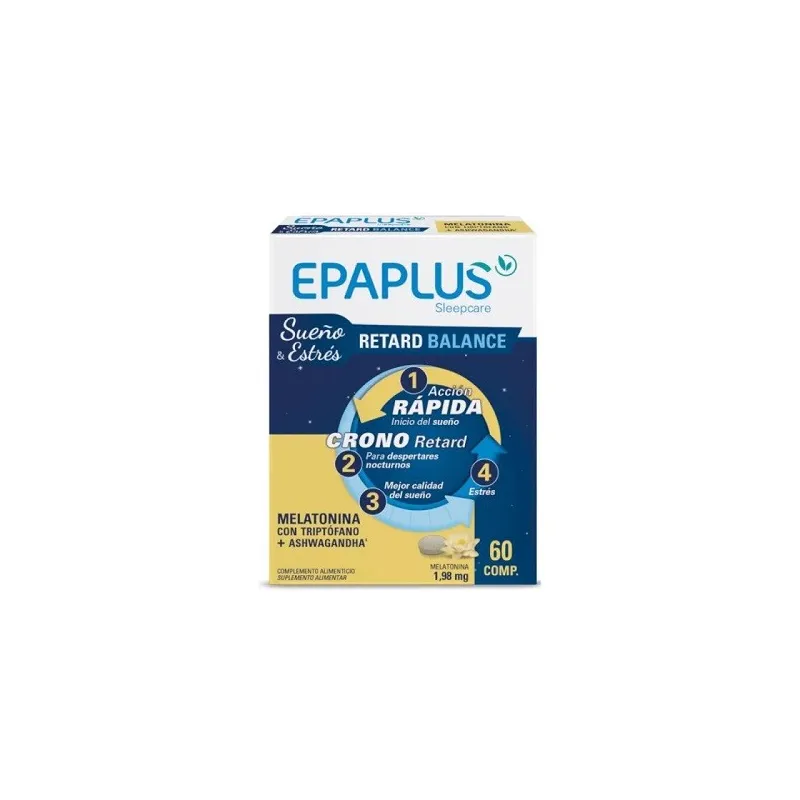 Epaplus Sleepcare Melatonina Retard Balance sueño&estrés es un complemento alimenticio en comprimidos de liberación gradual, formulado con melatonina, extracto de ashwagandha, triptófano, vitaminas del grupo B y minerales seleccionados. Está diseñado para ofrecer un aporte sostenido de melatonina durante la noche y contribuir a la regulación de los ritmos circadianos. Su perfil nutracéutico integra vitaminas y minerales que participan en el metabolismo energético y en el funcionamiento normal del sistema nervioso.