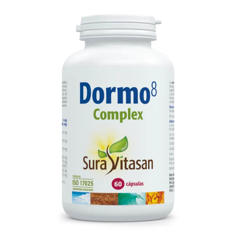 Sura Vitasan Dormo8 Complex, 60 cápsulas es un complemento alimenticio que combina melatonina, magnesio y extractos de plantas como manzanilla, pasiflora, lúpulo y escutelaria. Estos ingredientes contribuyen a la regulación del ritmo circadiano y favorecen la relajación mental y muscular. La melatonina participa en el ciclo de sueño-vigilia, el magnesio apoya la función del sistema nervioso y los extractos vegetales aportan propiedades calmantes.