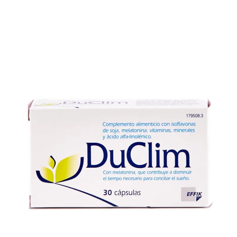 Duclim es un complemento alimenticio diseñado para mujeres en etapa de menopausia. Su fórmula combina extracto de soja, magnesio, vitaminas del grupo B y ácido alfa-linolénico en proporciones adaptadas a las necesidades nutricionales en esta fase de la vida.
