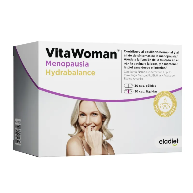 Eladiet Vitawoman Menopausia Hydrabalance es un complemento alimenticio especialmente formulado para acompañar a la mujer durante la etapa de la menopausia. Su combinación de ingredientes naturales está orientada a equilibrar los cambios hormonales y a contribuir al mantenimiento de la hidratación y la salud de la piel y mucosas.