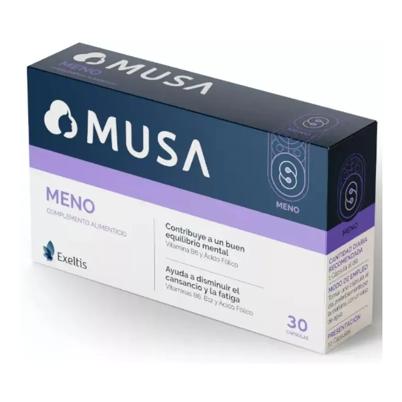 Exeltis Musa Meno es un complemento alimenticio formulado con una mezcla sinérgica de ingredientes de origen natural. Su composición incluye extracto de lúpulo, aceite de onagra, extracto de azafrán, triptófano y vitamina D, ingredientes cuyas características permiten apoyar el bienestar general durante la etapa de la menopausia.*