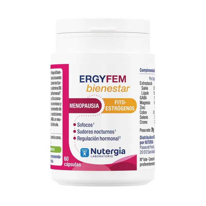 Ergyfem Bienestar es un complemento alimenticio en cápsulas vegetales que combina extractos de plantas con aminoácidos, vitaminas y minerales. Sus ingredientes han sido seleccionados para aportar fitoestrógenos de salvia y lúpulo, GABA, magnesio, zinc, selenio, cromo y vitaminas del grupo B. Cada uno de estos componentes puede contribuir al bienestar femenino durante la menopausia.