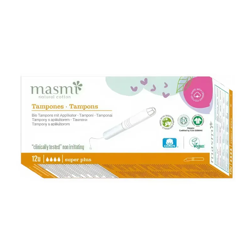 El tampón Super Plus con aplicador Masmi es un producto de higiene íntima diseñado para la gestión del flujo menstrual intenso. Incorpora un aplicador que facilita la inserción y está elaborado con algodón orgánico libre de cloro y químicos, pensado para adaptarse al ritmo activo diario.