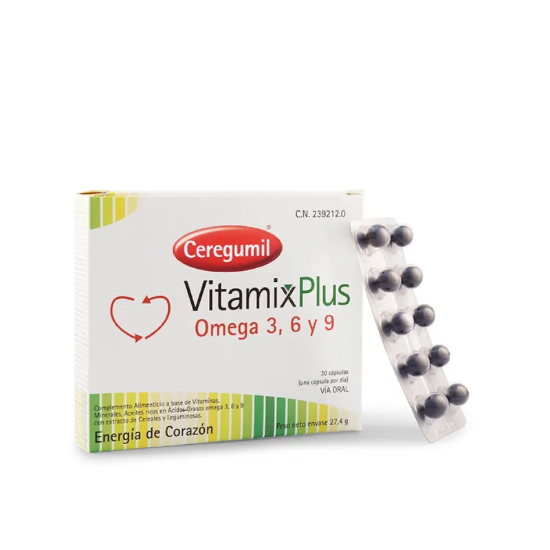 Ceregumil Vitamix Plus es un complemento alimenticio formulado para aportar una combinación equilibrada de ácidos grasos esenciales, vitaminas y minerales de acuerdo con la normativa del Reglamento (CE) nº 1924/2006 y las recomendaciones de AESAN. Su composición integra omega 3, omega 6 y omega 9 procedentes de fuentes seleccionadas, junto a un complejo de vitaminas del grupo B, vitamina C y D, así como minerales como hierro, zinc y selenio. Esta fórmula ha sido diseñada para complementar la ingesta diaria de estos nutrientes, contribuyendo a mantener el correcto metabolismo energético y el funcionamiento normal de las defensas del organismo.