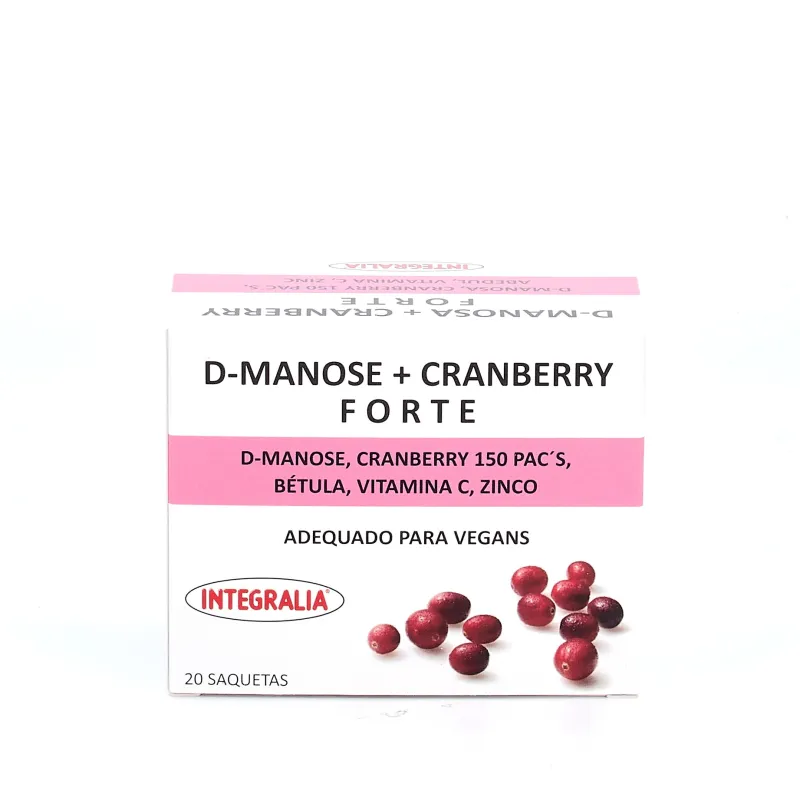 Integralia D-Manosa Cranberry Forte es un complemento alimenticio en formato sobres que combina D-Manosa, extracto de arándano americano, abedul, vitamina C y zinc. Esta mezcla está diseñada para favorecer la función normal del tracto urinario mediante la acción sinérgica de sus ingredientes. Se presenta en envase con 20 sobres de fácil disolución en agua, pensado para un uso diario de 20 días.