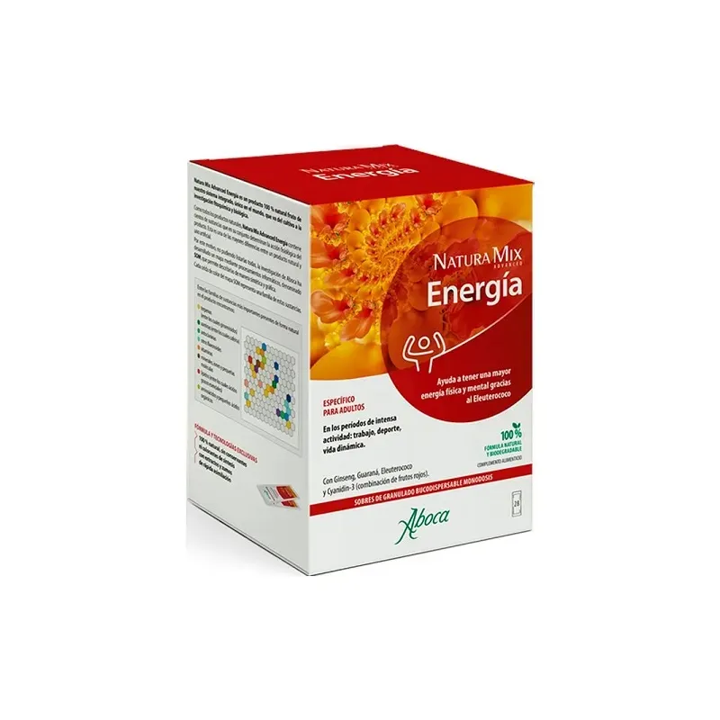 Aboca Natura Mix Advanced Energía sobres bucodispersables es un complemento alimenticio en formato de polvo diseñado para aportar, a través de sus ingredientes, apoyo al metabolismo energético en momentos de elevada demanda física o mental. Cada sobre contiene un complejo multivitamínico junto con extractos de ginseng, eleuterococo, guaraná y un concentrado de frutos rojos (arándano, mora y saúco) estandarizado en antocianinas.