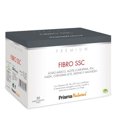 Prisma Natural Premium Fibro SSC es un complemento alimenticio presentado en sobres que combina un complejo de vitaminas del grupo B, aminoácidos esenciales y coenzima Q10. Esta fórmula ha sido desarrollada para contribuir al metabolismo energético normal y al funcionamiento saludable del sistema nervioso central. Cada envase contiene 60 sobres de fácil disolución en agua, permitiendo su incorporación cómoda y rápida en la rutina diaria sin necesidad de un gran volumen de líquido.