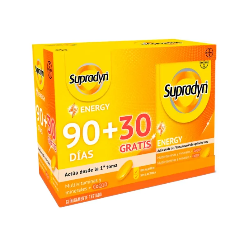 Supradyn Energy es un complemento alimenticio que aporta una mezcla de 13 vitaminas, 12 minerales y coenzima Q10. Sus ingredientes contribuyen al metabolismo energético normal, ayudando al organismo a transformar los nutrientes en energía. Está indicado para quienes desean un aporte diario completo de micronutrientes para apoyar la producción de energía y el rendimiento en actividades cotidianas.