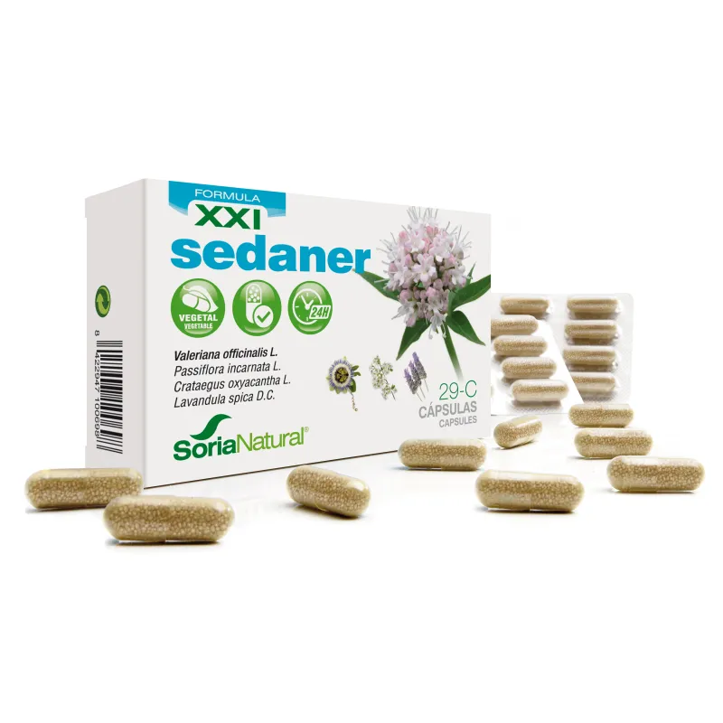 Soria Natural Fórmula XXI Sedaner 29-C es un complemento alimenticio de origen natural que combina extractos botánicos con el fin de promover el confort del sistema nervioso. La asociación de valeriana, pasiflora y aceite esencial de lavanda forma una mezcla diseñada para contribuir de manera natural a la relajación y la serenidad en situaciones de tensión puntual.