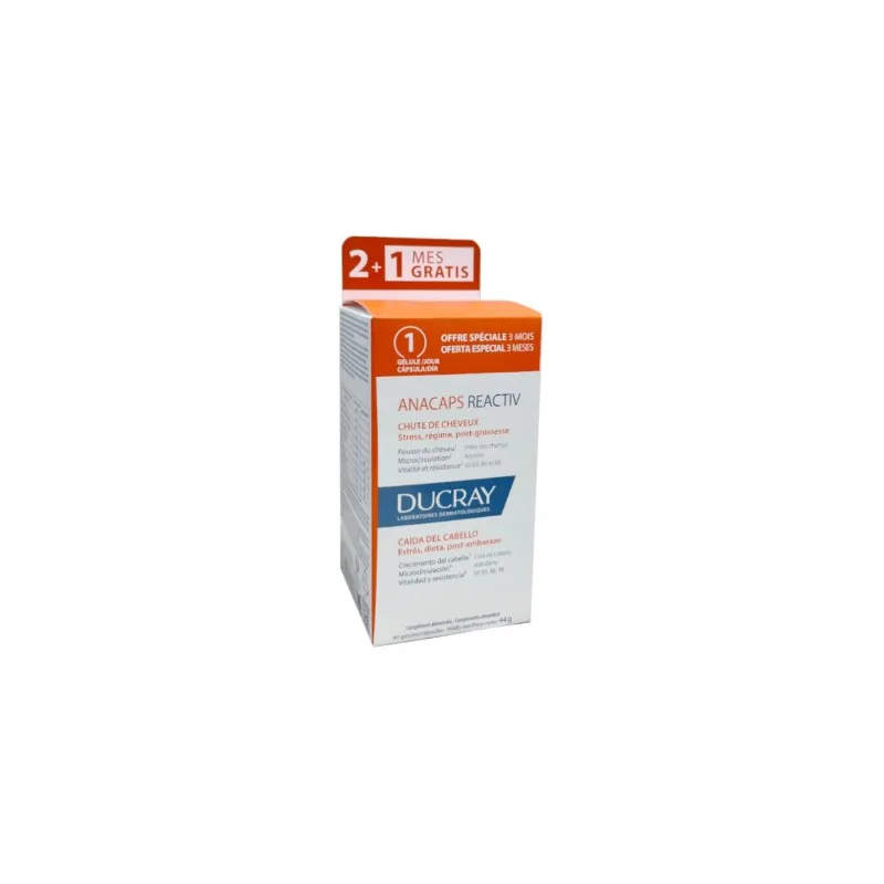 Ducray Anacaps Reactiv es un complemento alimenticio con nutrientes seleccionados para contribuir a la nutrición del cabello y las uñas. Su fórmula incorpora vitaminas del grupo B, aminoácidos azufrados, hierro, biotina y oligoelementos esenciales. Los ingredientes de Anacaps Reactiv participan en la síntesis de queratina y en los procesos metabólicos que favorecen el mantenimiento de la estructura capilar y ungueal. Este complemento se presenta como una opción para complementar la ingesta diaria de nutrientes en personas que buscan reforzar el aspecto y la resistencia del cabello y las uñas, dentro de una alimentación equilibrada.