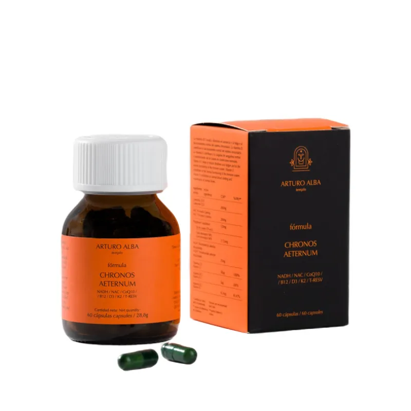 Arturo Alba Chronos Aeternum es un complemento alimenticio en cápsulas que incorpora una combinación de antioxidantes y micronutrientes destinados a contribuir al mantenimiento de la protección celular. Resveratrol, coenzima Q10, ácido alfa-lipoico, vitaminas C y E, y zinc han sido seleccionados por su perfil de seguridad, biodisponibilidad y calidad. Esta fórmula se fabrica bajo Buenas Prácticas de Fabricación, garantizando un producto sin gluten ni lactosa. El formato en cápsulas facilita la ingesta diaria y puede integrarse en una dieta equilibrada junto con hábitos de vida saludables, como actividad física y descanso adecuados.