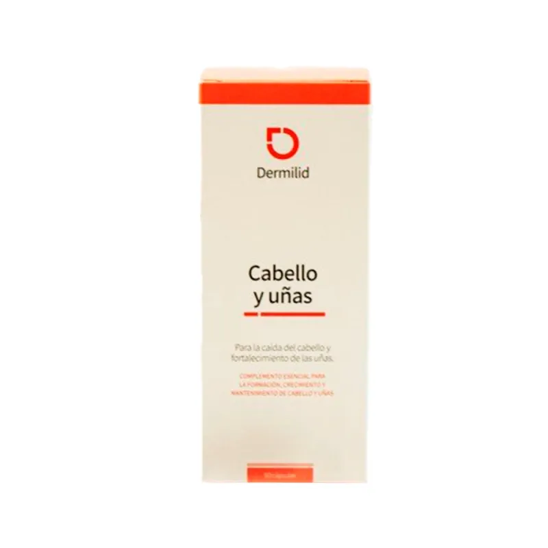 Dermilid Cabello y Uñas es un complemento alimenticio en cápsulas que combina aminoácidos, vitaminas y oligoelementos para contribuir al bienestar de los tejidos de la fibra capilar y de la estructura ungueal. Su fórmula está diseñada para aportar nutrientes clave que intervienen en la síntesis de proteínas estructurales y en la conservación de la fortaleza y la resistencia.
