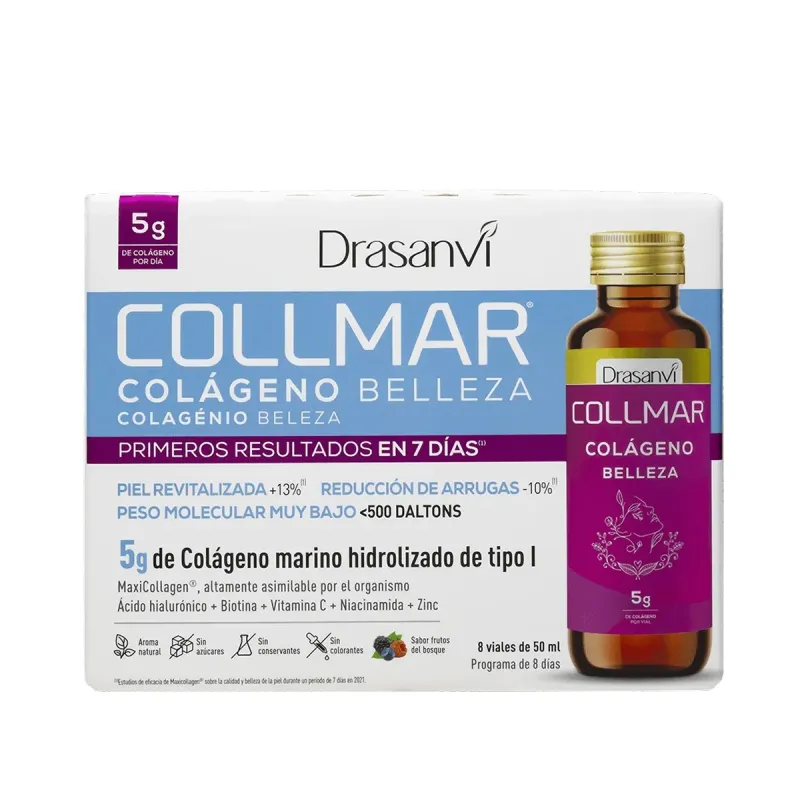Drasanvi Collmar Colágeno Belleza es un complemento alimenticio líquido formulado en viales monodosis que combina colágeno marino hidrolizado, ácido hialurónico, vitamina C, biotina y zinc. Está desarrollado para su administración diaria con el propósito de complementar la ingesta de estos nutrientes esenciales en adultos que buscan mantener una dieta equilibrada y apoyar la salud de la piel, cabello y uñas desde el interior.