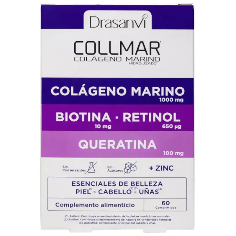 Drasanvi Collmar Esenciales Belleza es un complemento alimenticio que reúne colágeno marino hidrolizado, queratina, biotina, vitamina A, vitamina B6 y zinc. Cada comprimido aporta nutrientes seleccionados para contribuir al mantenimiento de la estructura y fortaleza del cabello, uñas y piel desde el interior. El envase de 60 comprimidos proporciona un suministro para un mes de tratamiento.