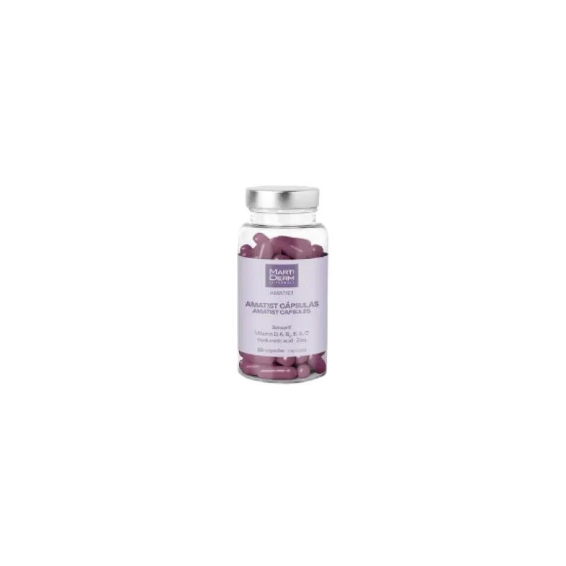 Martiderm Amatist es un complemento alimenticio en cápsulas formulado con una combinación seleccionada de colágeno marino, extracto de uva, vitamina C y vitamina E, así como otros micronutrientes. Esta formulación se ha desarrollado con el fin de ofrecer un aporte nutricional que apoye los procesos fisiológicos implicados en la estructura y función cutánea. El colágeno marino se asocia con los componentes de la matriz extracelular y contribuye al soporte de la dermis, mientras que los antioxidantes procedentes del extracto de uva y de las vitaminas C y E ayudan a mantener la protección frente a agentes oxidativos. Su uso está pensado para complementar la dieta de personas que deseen contribuir al cuidado integral de la piel desde el interior.