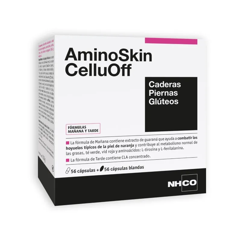 NHCO AminoSkin CelluOff es un complemento alimenticio que aporta ingredientes específicos para contribuir al metabolismo normal de los macronutrientes y al mantenimiento de la firmeza de la piel. Está especialmente formulado para ofrecer un aporte nutricional que interviene en los procesos de drenaje y en el equilibrio del tejido cutáneo.