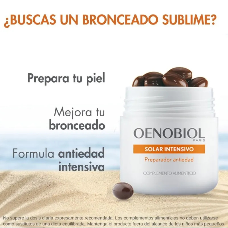 Oenobiol Solar Intensivo Preparador Antiedad es un complemento alimenticio diseñado para pieles con signos de envejecimiento prematuro que desean prepararse para la exposición solar. Su fórmula combina zinc, vitamina C, actilycopeno, luteína y selenio, nutrientes que participan en el mantenimiento de la integridad de la piel y en la protección frente al estrés oxidativo. Está indicado para quienes buscan apoyar la firmeza y elasticidad durante y después de la exposición solar.