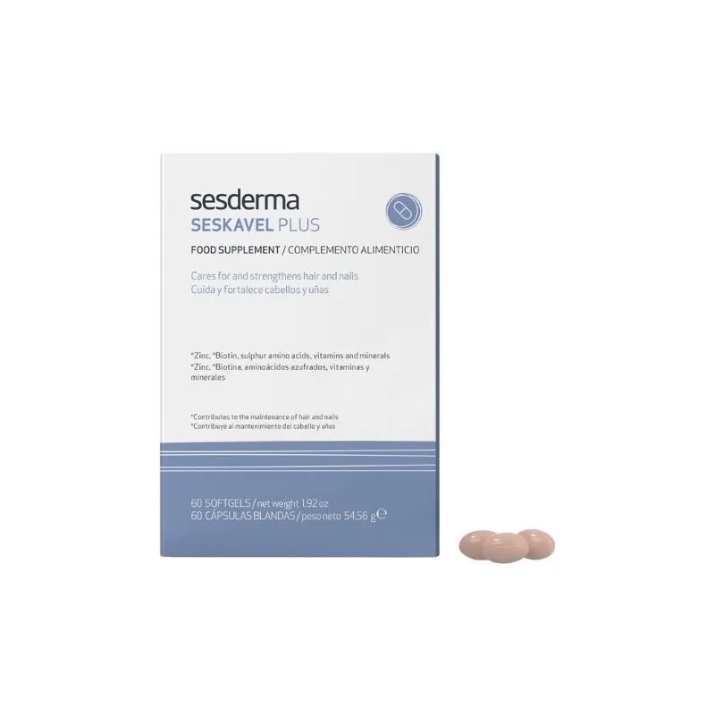 Sesderma Seskavel Plus es un complemento alimenticio en cápsulas que aporta metionina, cistina, vitaminas A, E, biotina y minerales (zinc y hierro). Estos nutrientes han sido seleccionados para contribuir al adecuado mantenimiento de la estructura de la queratina capilar y ungueal. La combinación de aminoácidos y vitaminas complementa la dieta diaria, favoreciendo un entorno nutricional adecuado en momentos de fragilidad de cabello y uñas.