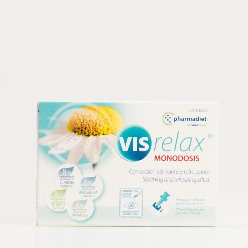 VisRelax son gotas oculares humectantes para lubricar y cicatrizar. Además alivian la sequedad ocular severa e irritaciones causadas por agentes extraños: como pueden ser la conjuntivitis o la rinitis. También son utilizadas para las molestias causadas por exposiciones a rayos solares, agua del mar y de la piscina, aire acondicionado, falta de sueño, calor o frío excesivo, viento, humo y por causas fisiológicas como la menopausia o el envejecimiento.