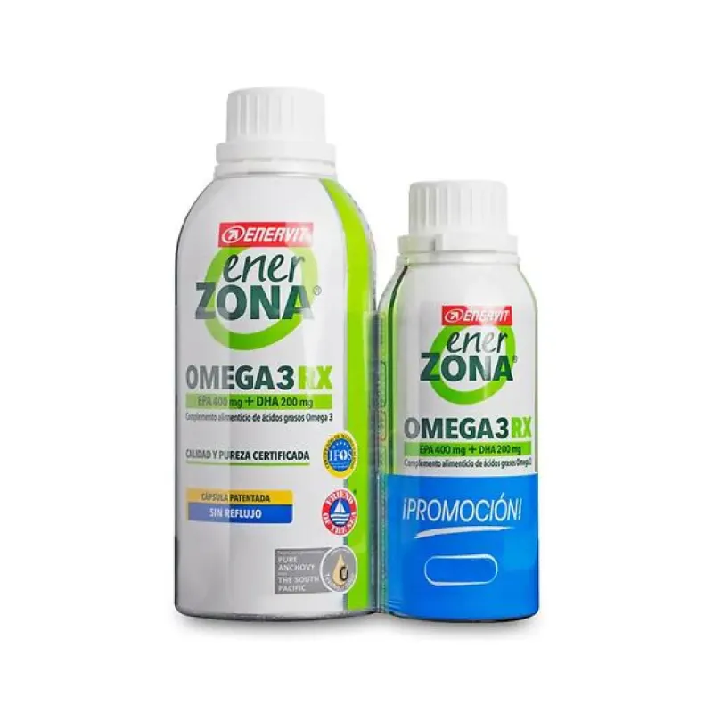 enerZona Omega3 RX es un complemento alimenticio formulado con ácidos grasos omega 3 de alta pureza, obtenidos mediante destilación molecular y certificados por IFOS. Cada cápsula aporta 400 mg de EPA y 200 mg de DHA, nutrientes esenciales que se encuentran naturalmente en el organismo y cuya ingesta complementaria puede resultar adecuada en la dieta de adultos y niños.