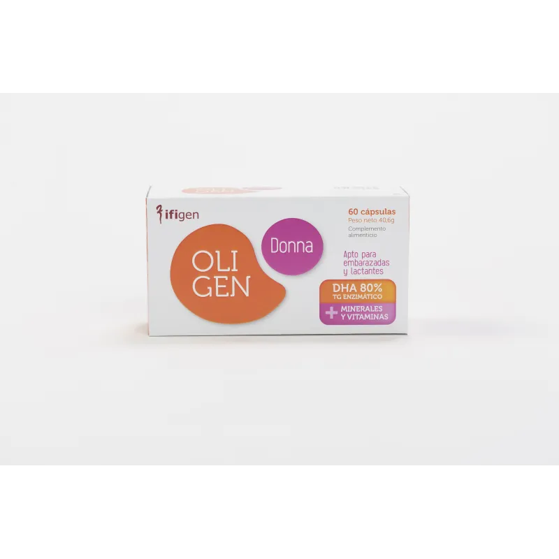 Oligen Donna Ifigen es un complemento alimenticio especialmente formulado para aportar nutrientes clave durante el embarazo y la lactancia. Su composición combina ácidos grasos omega 3 de alta pureza, vitaminas del grupo B, vitaminas A, C y D, junto con minerales como hierro y zinc, destinados a complementar la dieta de la mujer en estas etapas.