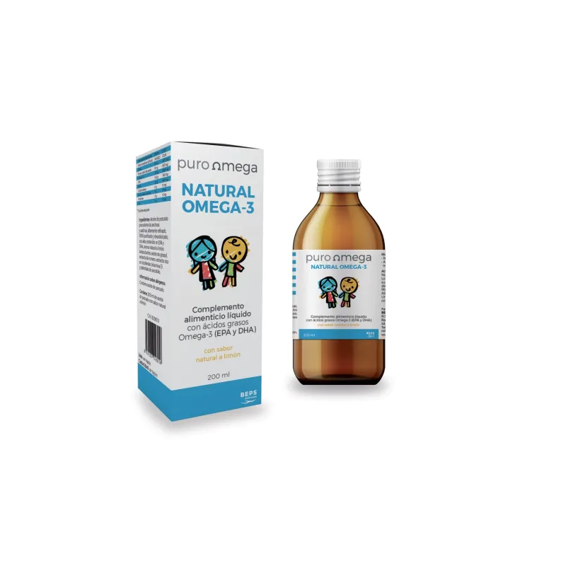 Puro Omega Natural Omega 3 Niños es un complemento alimenticio que aporta ácidos grasos omega-3 EPA y DHA procedentes de aceite de pescado ecológico. El DHA y el EPA contribuyen al desarrollo normal del sistema nervioso y al mantenimiento de las funciones cognitivas en la infancia.