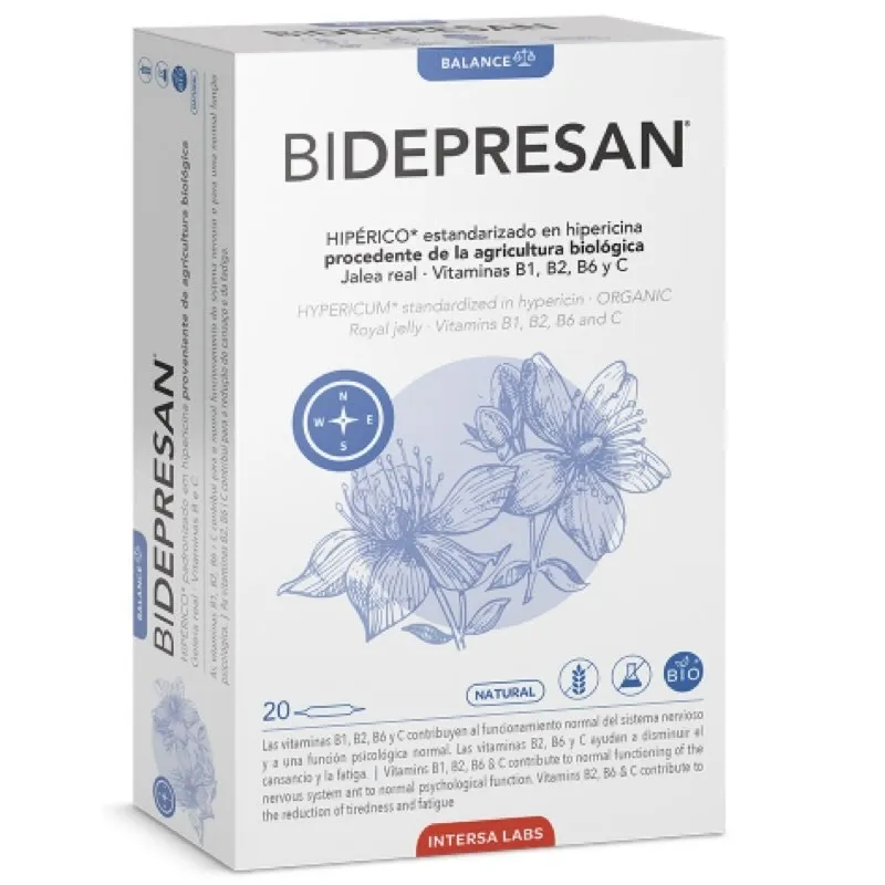Intersa Bidepresan es un complemento alimenticio líquido en ampollas que incorpora extractos de hipérico, rhodiola y griffonia, ingredientes de origen natural seleccionados para contribuir al bienestar emocional y el equilibrio nervioso.