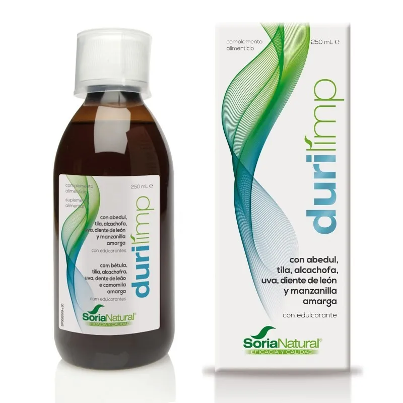 Soria Natural Durilimp es un complemento alimenticio líquido que combina extractos de cola de caballo, diente de león y otras plantas seleccionadas por sus propiedades diuréticas y depurativas. Presentado en un envase de 250 ml con tapón dosificador, este producto está formulado para favorecer el equilibrio hídrico y contribuir al proceso de eliminación de toxinas a través de la orina. La selección de sus ingredientes obedece a criterios de calidad y pureza, garantizando la eficacia de los extractos vegetales.