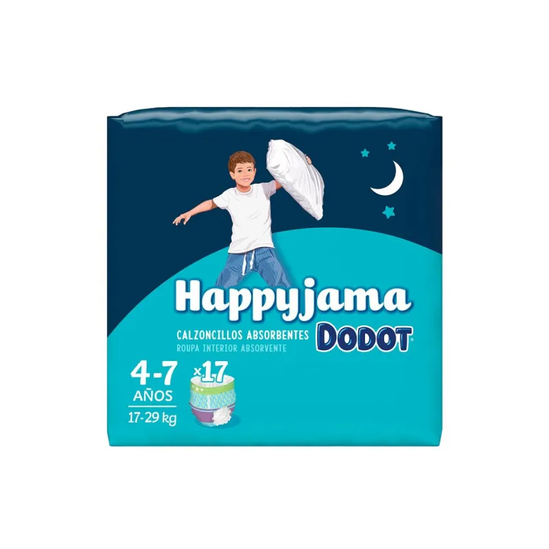 Dodot Happyjama Boys Carry pack talla 7 son unas braguitas desechables elaboradas para la protección nocturna de niños con un peso entre 17 y 29 kilos. Este modelo se ajusta a la anatomía del pequeño, proporcionándole comodidad y seguridad al dormir. Además, su sistema súper absorbente evita la humedad y los derrames de orina en la cama.