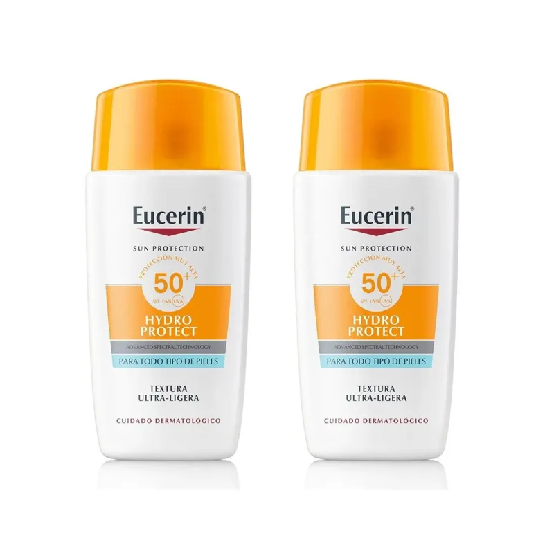Eucerin Sun Face Hydro Protect SPF50+ Duplo ofrece dos envases de 50 ml de fluido facial ultraligero que combina una alta protección solar con una sensación de ligereza y frescor.