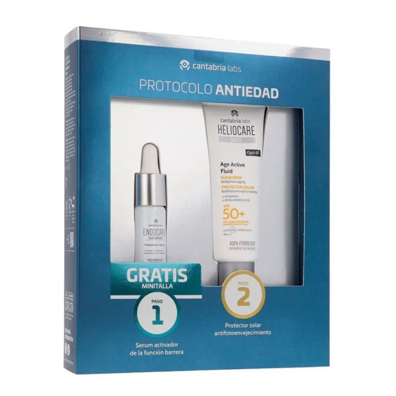 Heliocare 360º Age Active Fluid SPF50+ fotoprotege con accción antiedad que protege, unifica. Este pack contiene de regalo Endocare Age Barrier Serum, 10 ml.