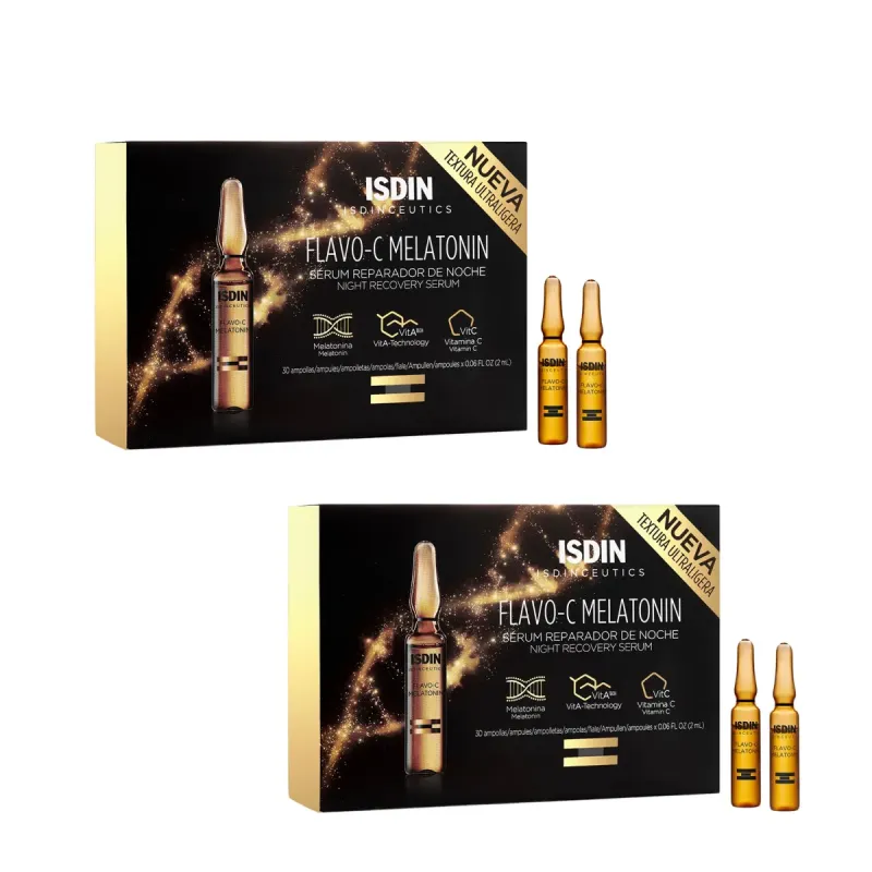 Isdinceutics Flavo-C Melatonin Duplo es un tratamiento facial en formato de ampollas diseñado para usarse durante la noche. Cada ampolla contiene una combinación de ingredientes que actúan mientras duermes, con el objetivo de apoyar las defensas antioxidantes naturales de la piel y favorecer sensaciones de confort y vitalidad. Este producto se presenta en un formato duplo con dos cajas de 30 ampollas cada una, ideal para continuar la rutina nocturna de cuidado facial por periodos prolongados.