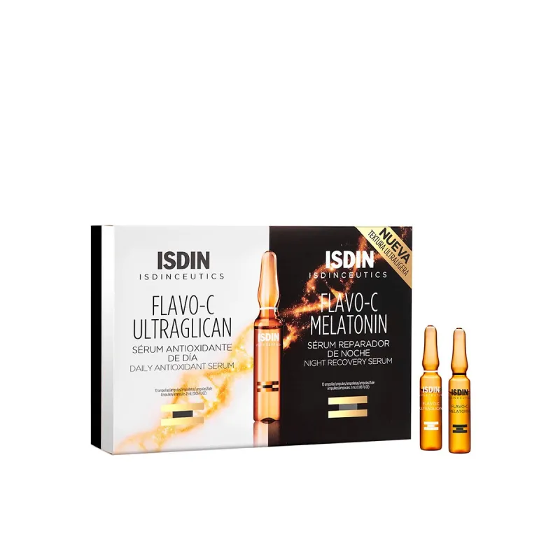 Cada ampolla, contiene diferentes componentes, para el día cuentas con Isdin Isdinceutics Flavo-C Ultraglican, una de las pocas del mercado que contiene vitamina C como principal aliado, siendo un potente antioxidante y protector contra los radicales libres, además de fomentar la producción de colágeno.