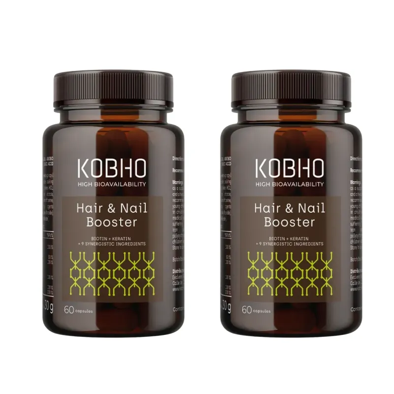 Kobho Hair & Nail Booster Duplo 2x60 cápsulas es un complemento alimenticio diseñado para ayudar a aportar nutrientes habituales de la dieta que participan en funciones nutricionales normales relacionadas con la estructura y bienestar del cabello, las uñas y la piel dentro de una alimentación equilibrada y un estilo de vida saludable.