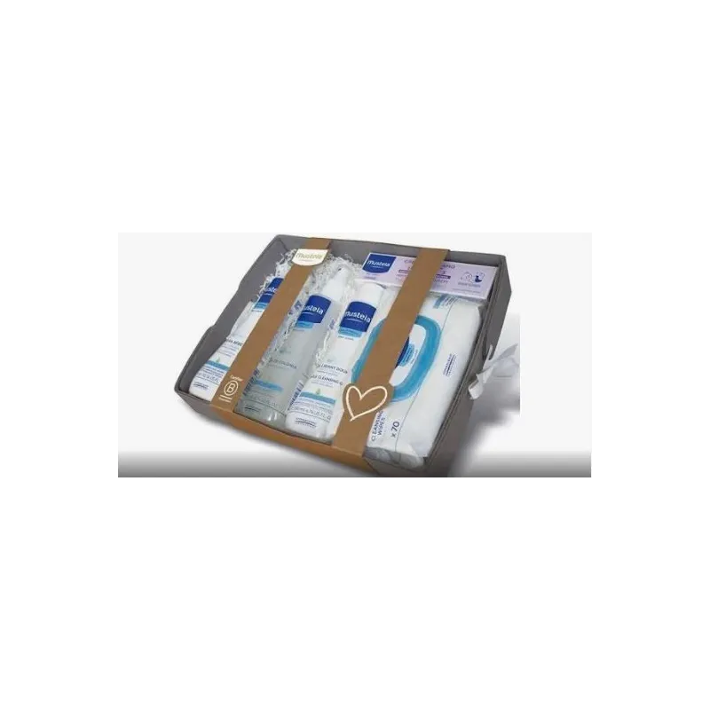 Mustela Canastilla Gris todo lo necesario para la higiene y el cuidado de la piel del recién nacido en una práctica bolsa.