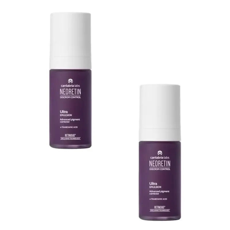Neoretin Discrom Ultra Emulsion Duplo se presenta en un práctico formato de dos frascos de 30 ml cada uno, lo que facilita su uso y almacenamiento. Este diseño permite que el usuario tenga un suministro adecuado para un uso prolongado, asegurando que se pueda seguir con la rutina de cuidado de la piel sin interrupciones. Además, su envase es ligero y fácil de transportar, ideal para llevar en viajes o en el día a día.