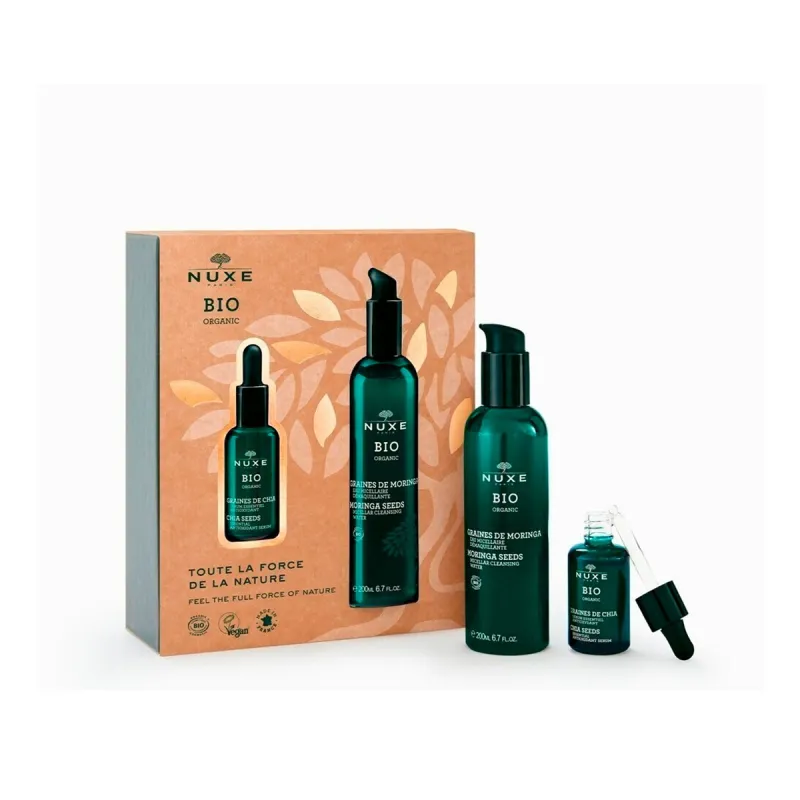 Pack especial de NUXE Poder de la Naturaleza, combina la acción antioxidante del Serum de Semillas de Chía y la limpieza del agua micelar de Semillas de Moringa.