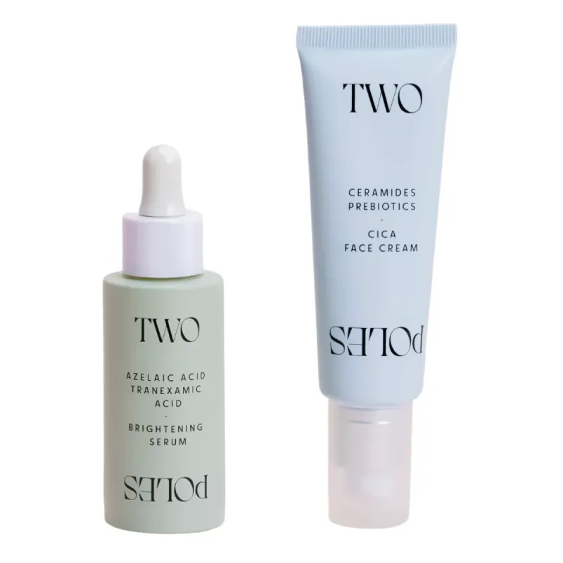El Dúo Bye Bye Manchas de Two Poles incluye dos productos complementarios —Brightening Serum y Cica Face Cream— diseñados para pieles que desean trabajar sobre irregularidades del tono, manchas y rojeces. Esta rutina de cuidado diario aborda tanto la fase de tratamiento como la de hidratación, combinando activos como ácido tranexámico, arbutina y niacinamida, junto con ingredientes calmantes que apoyan la barrera cutánea.