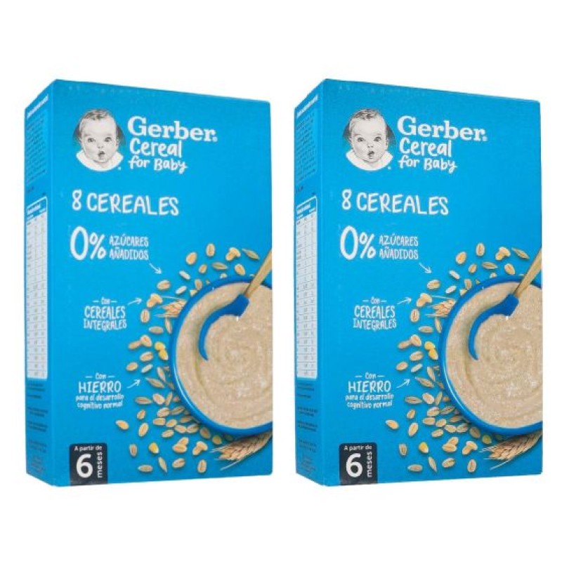 Nestle Gerber 8 Cereales es un paquete que contiene dos envases de 500 gramos cada uno, proporcionando una fuente nutritiva de 8 cereales diferentes, especialmente diseñados para ser una opción alimenticia saludable y deliciosa para los más pequeños de la casa.