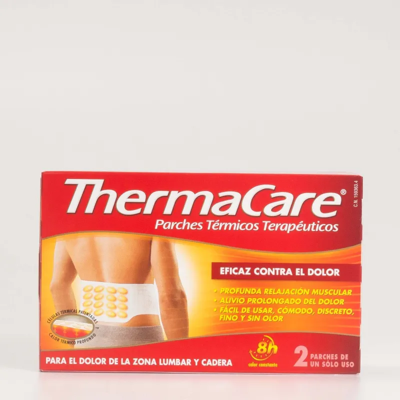 Los parches térmicos Thermacare se presentan en un envase que contiene 2 unidades para aliviar la zona lumbar y la cadera.