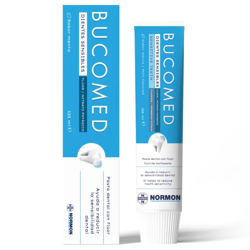 El dentífrico Bucomed se presenta en un formato de 125 ml, ideal para el uso diario. Su textura suave y su sabor refrescante hacen que el cepillado sea una experiencia agradable, mientras que sus componentes activos trabajan para ofrecer una protección duradera. Este producto es adecuado para adultos y niños mayores de 12 años que buscan una solución eficaz para la sensibilidad dental.