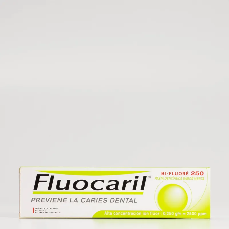 Fluocaril Bi-fluore 250 Pasta dentífrica, contiene una elevada proporción de flúor que evita las caries, protege del sarro y de la placa bacteriana.